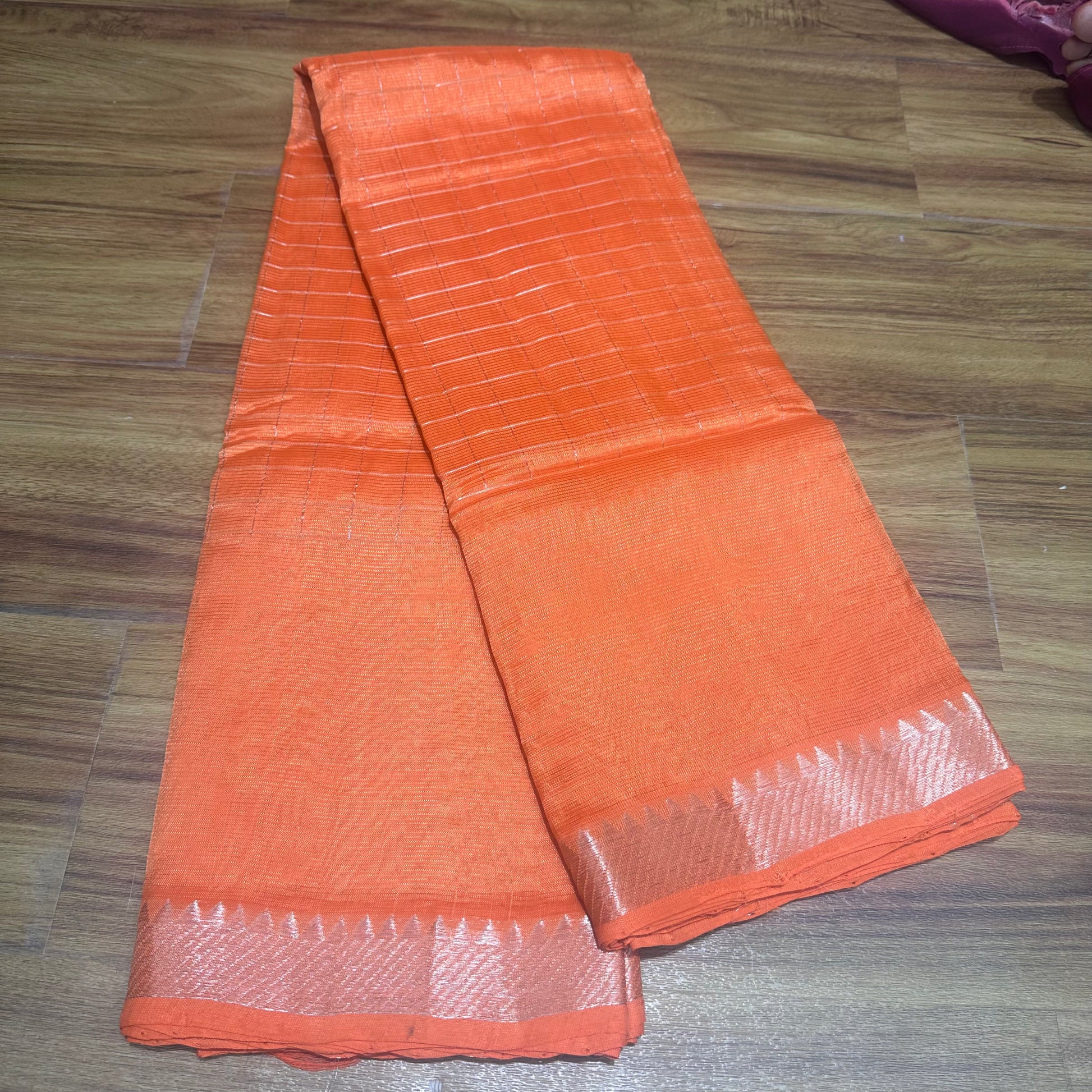 Beautiful collection of plain body soft silk sarees with contrast zari borders. Available in vibrant shades – Orange, Black with Silver Border, Maroon with Gold Border, and Royal Blue with Gold Border.